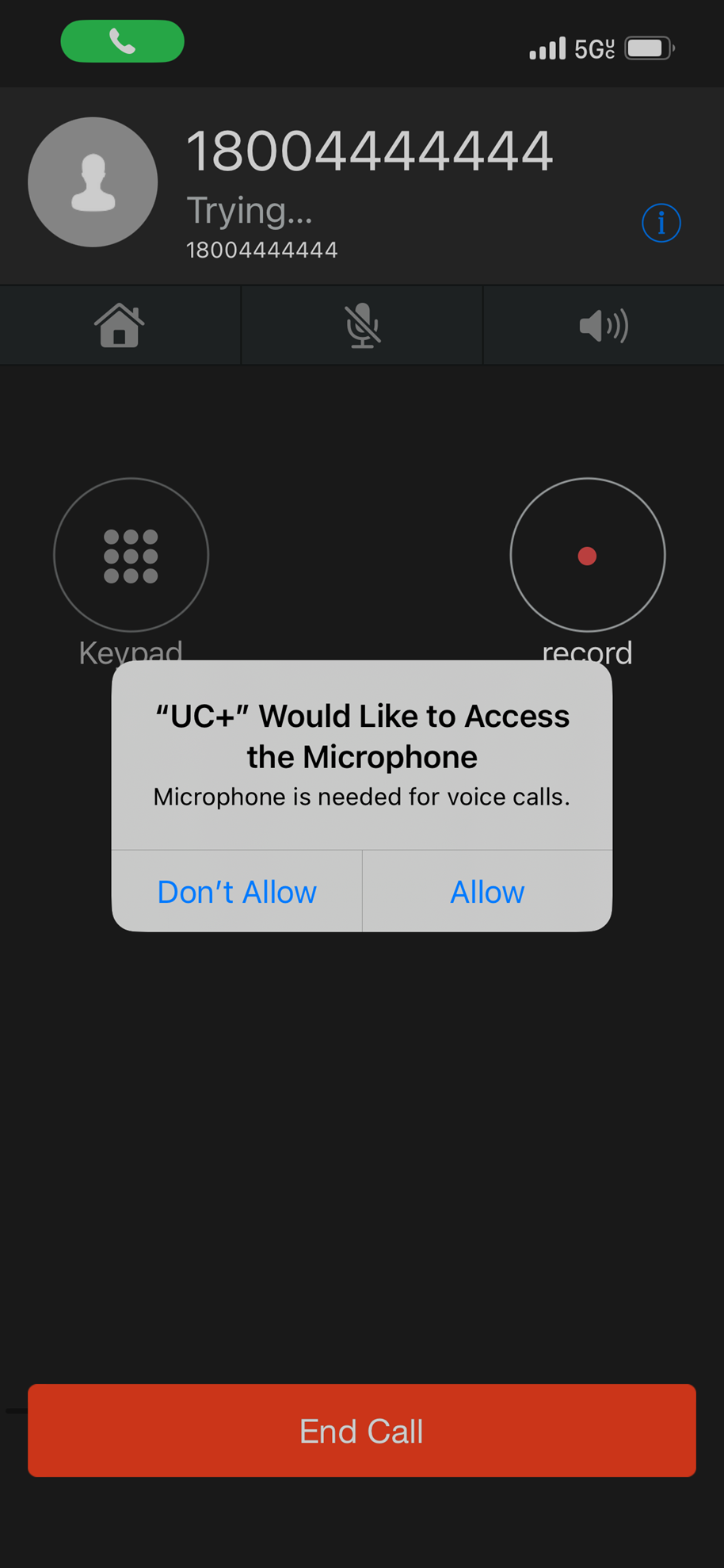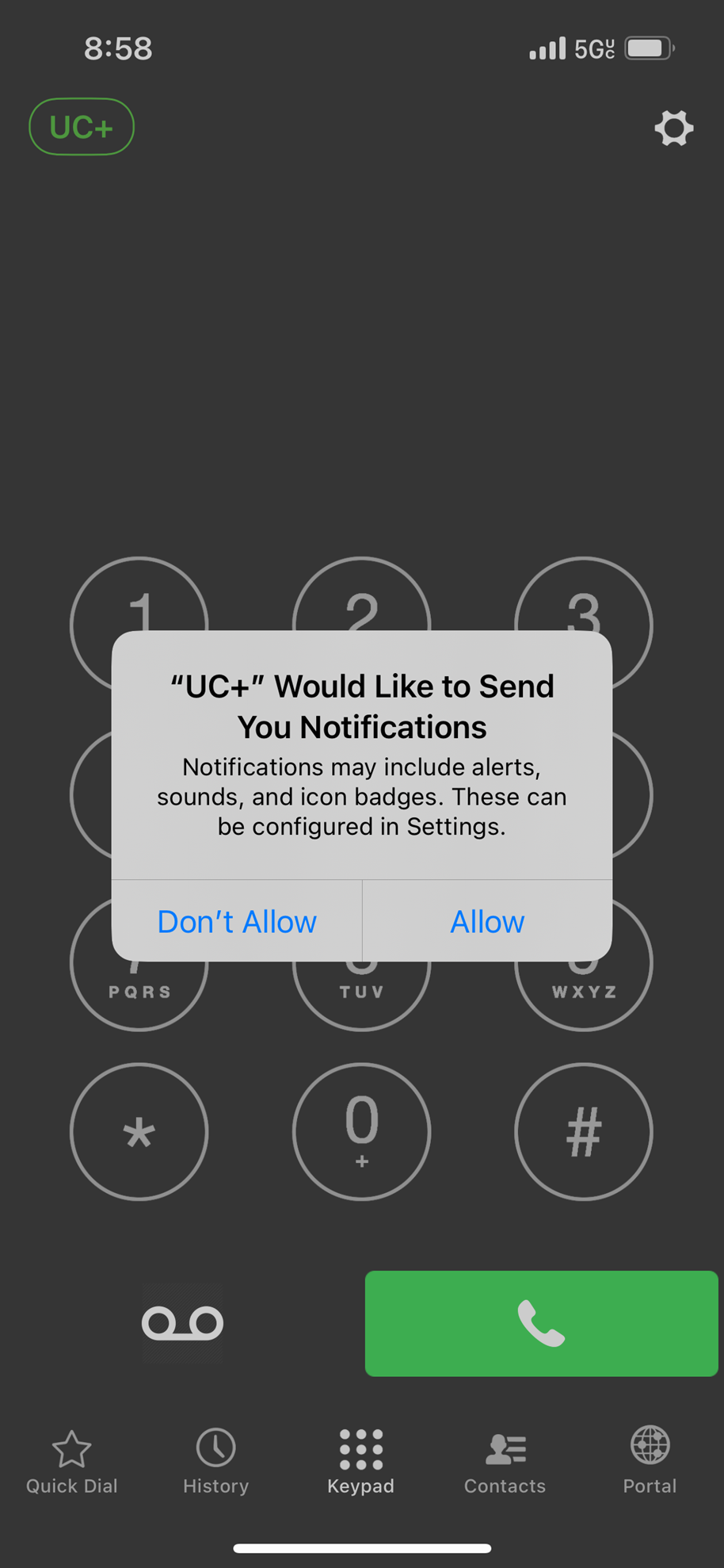 To access the UC+ settings select the “Keypad” option from the main menu. Then tap the gear icon on the top right section. The “Settings” screen will show the following options: Account Setup: Shows the user’s extension used by UC+. Test Push ...