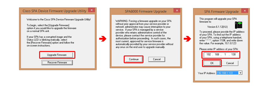 - Extract the EXE from the ZIP file and click on Upgrade Firmware, Continue, and enter in the IP of the SPA8000, then click OK.