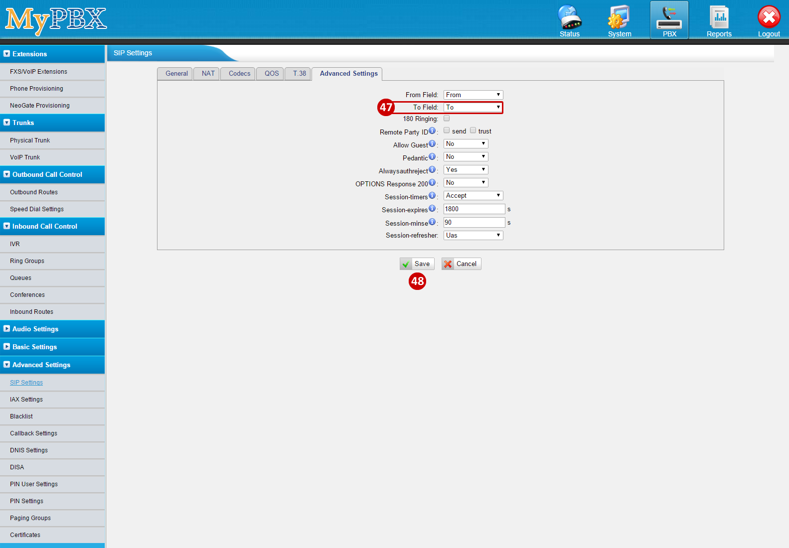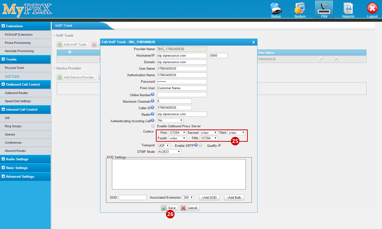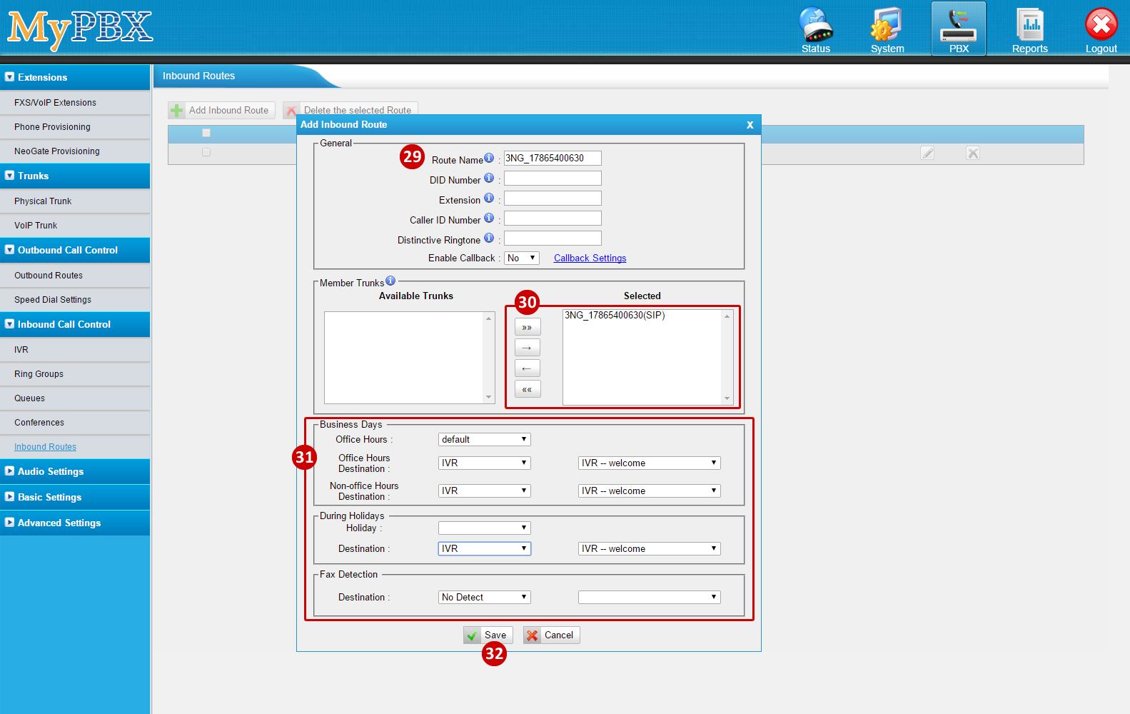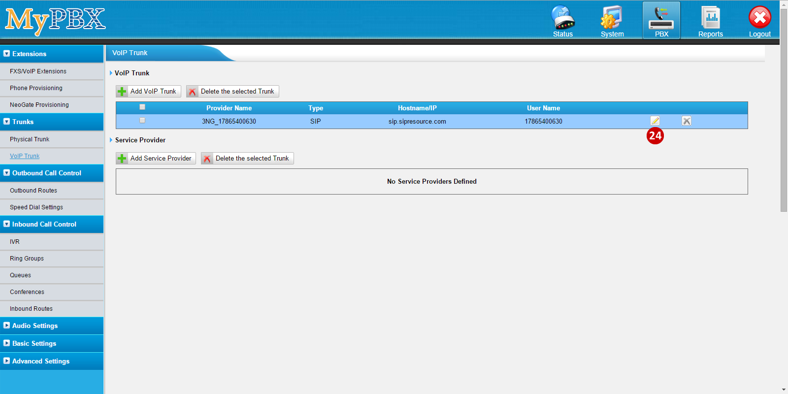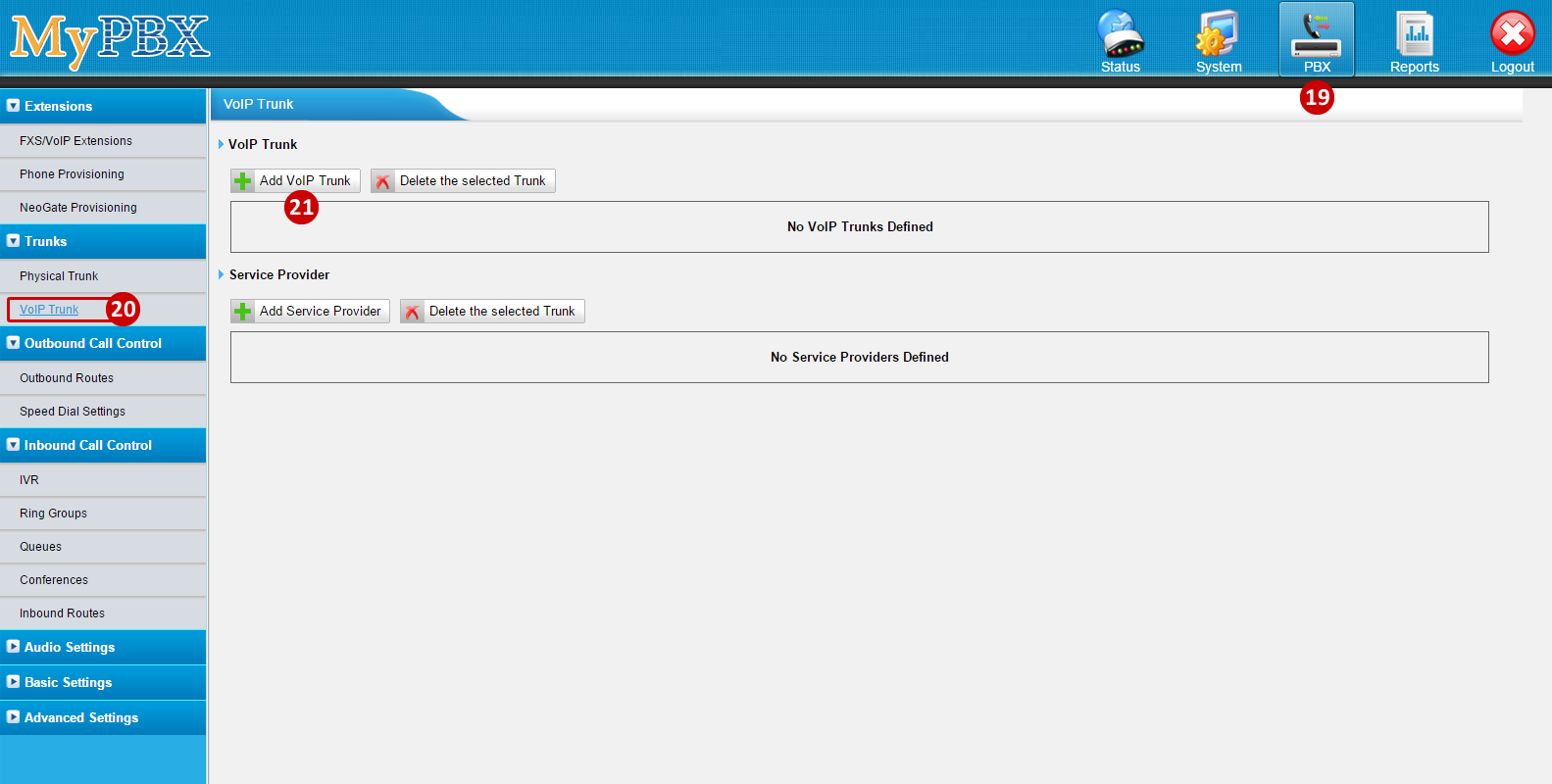 - To Add a VoIP Trunk, go to PBX