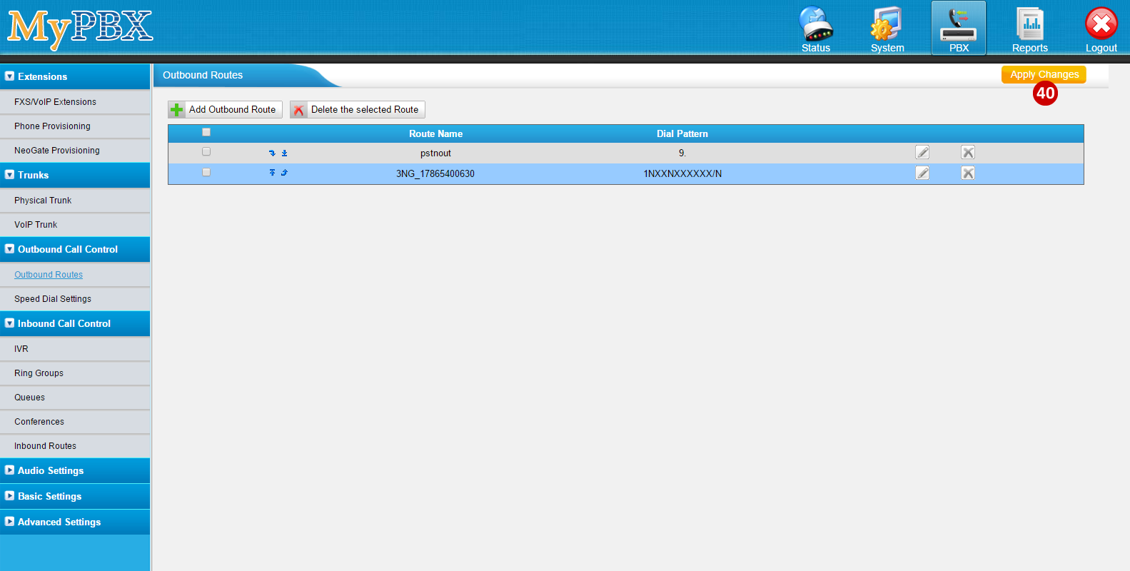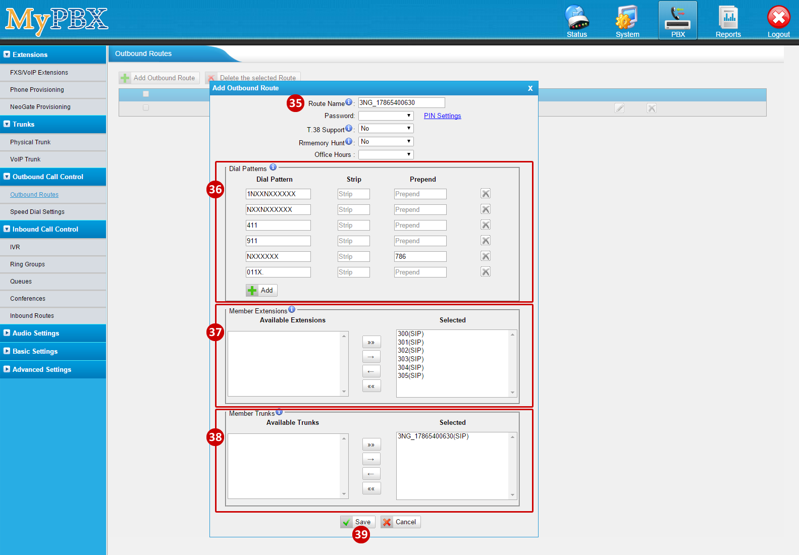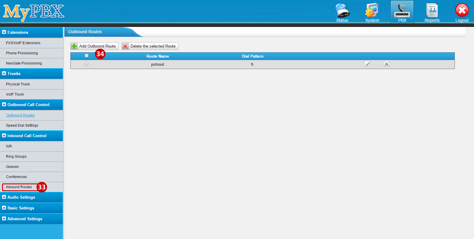 - Click on Add Outbound Route (by default the system has a PSTN out, which requires a 9 to dial out)