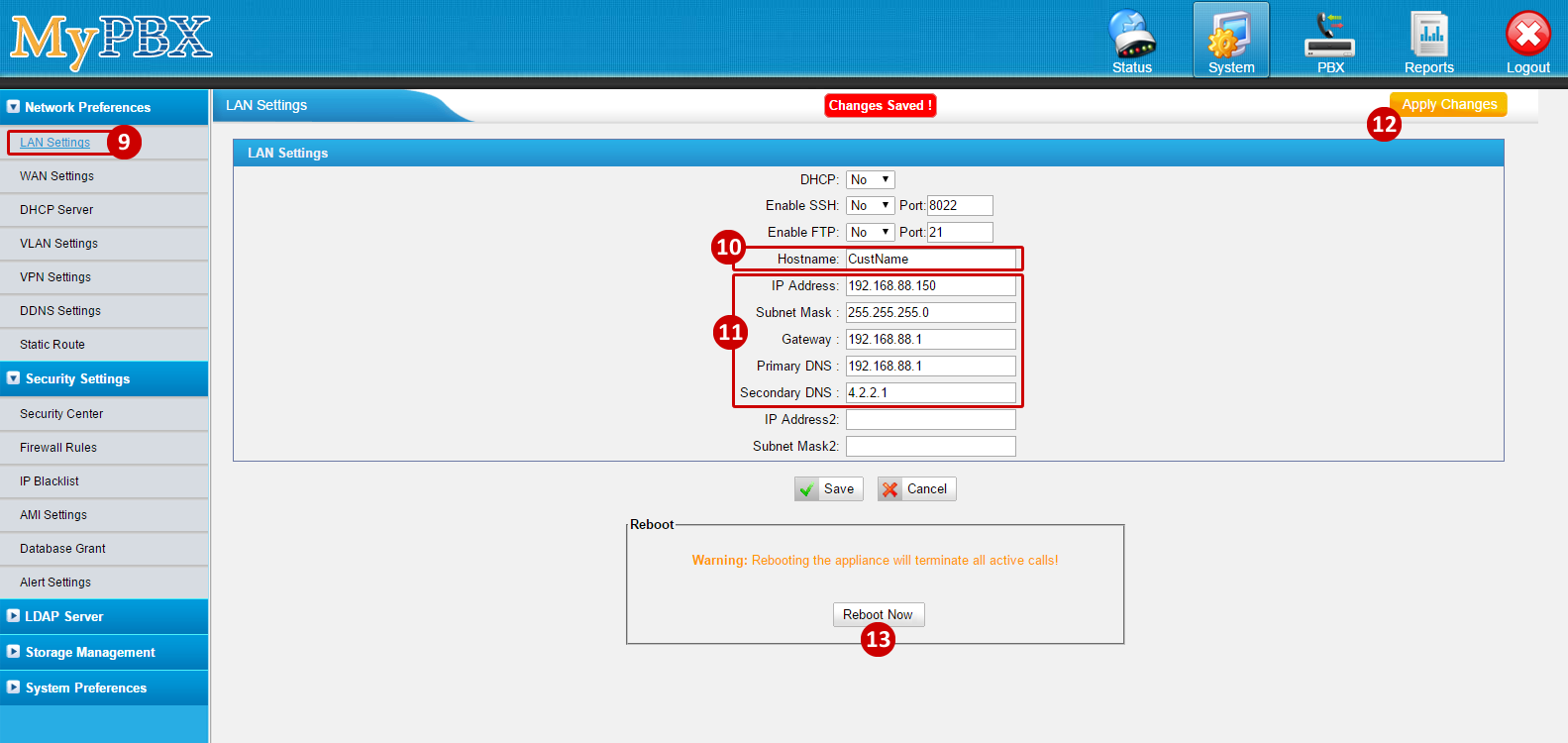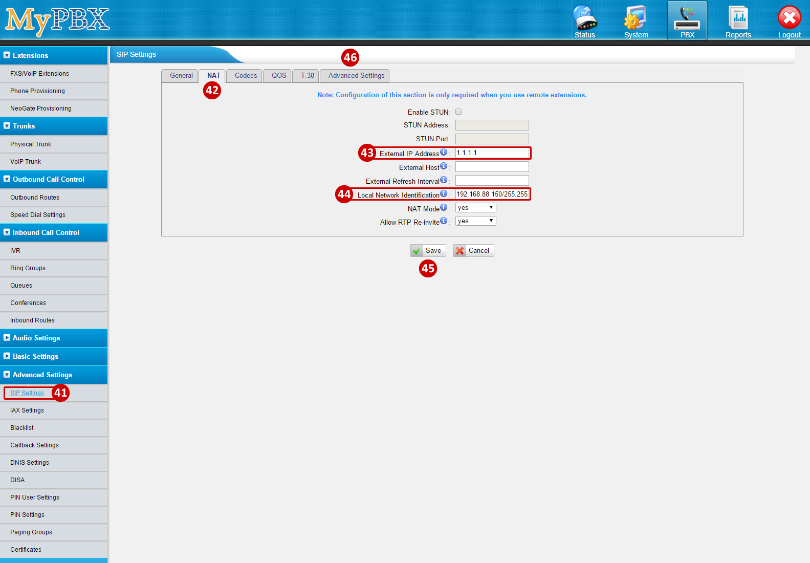 IF the PBX has a PUBLIC IP then set it on the External IP Address Field. - Set the Local Network Identification: 192.168.88.150/255.255.255.0 (LAN IP and Subnet)
