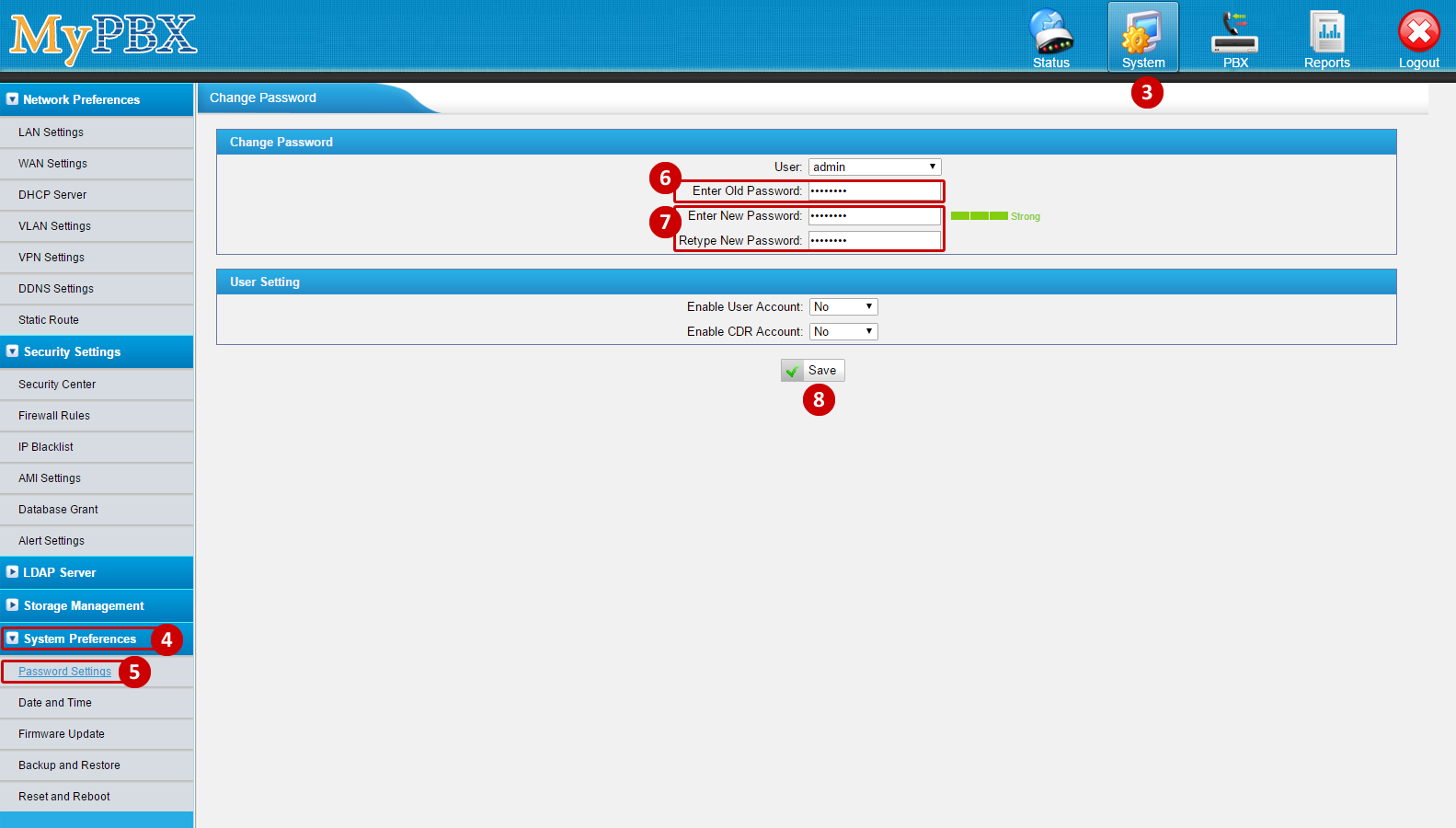 - To change the default password, click on System